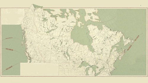 The data from several colonial maps from the Shortt Collection at the University of Saskatchewan Archives and Special Collections are compiled onto one image and erased. The utopic dreams of promised resources, names of claimed places, the borders, sea routes, and railways fade away. The piece shows the scars, the detritus of removal, while imagining a possible decolonized land. |