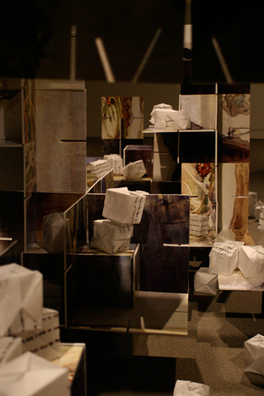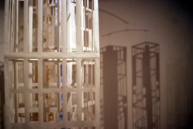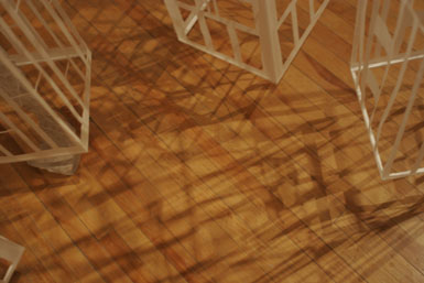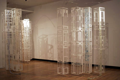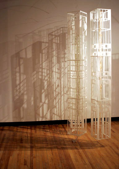 City Beautiful architecture informs the design of the tissue paper installation suspended in the gallery space. The work responds to the viewers' presence, dancing on the air currents of a human body moving through the installation. The moving tissue paper whispers the underlying ideals which inform us all. |