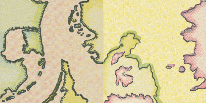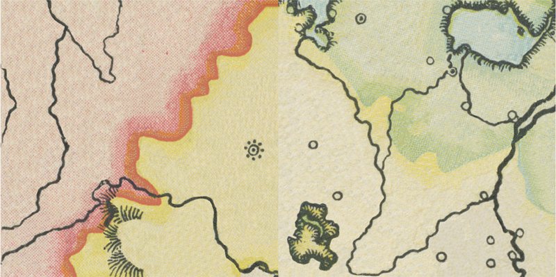 But One Empire digital print on canvas Each section is an abstraction of a map from an atlas published by the Canadian government in 1901. Intended as a settler recruitment tool, The Canadian Atlas was distributed free to British school children. The maps contained in the atlas are contrived to enhance perceptions of similarity between European and colonial lands. Through a process of abstraction, maps intended to facilitate settlement lose their power to claim. Without land borders or names, the maps are reduced to their aesthic elements. |
