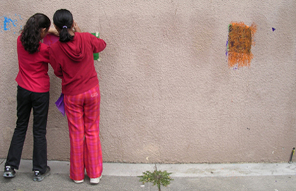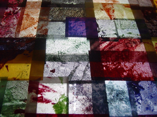 I invited several hundred commuity members of all ages to participate in a guided visual exploration of surface textures in their neighbourhood. These captured textures form the mosaic of the artwork, a textural map of patterned on an aerial photo of the neighbourhood. |