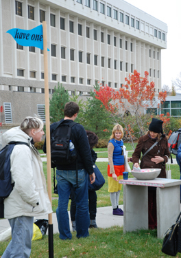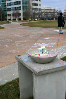A cast concrete table and bowl are installed in a central pedestrian space on the main campus at the University of Regina. Once a month, throughout the year-long installation, I fill the concrete bowl with items for viewers to interact with, respond to and enjoy. Fuse Magazine Artist Project: Winter, 2011