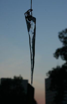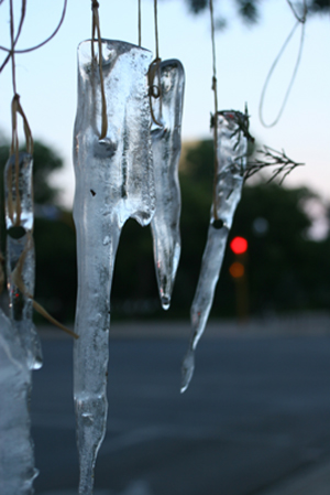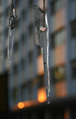 Icicles harvested in a prairie winter are reinstalled in the hot summer city. Dripping ensues........